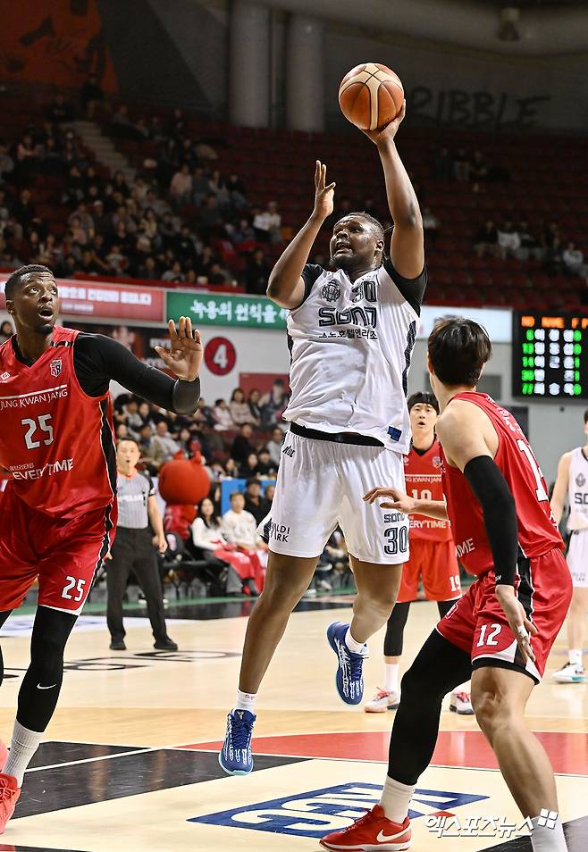 (엑스포츠뉴스 안양, 김한준 기자) 1일 오후 경기도 안양 정관장 아레나에서 열린 '2024-2025 KCC 프로농구' 안양 정관장과 고양 소노의 경기, 소노 번즈가 슛을 시도하고 있다.