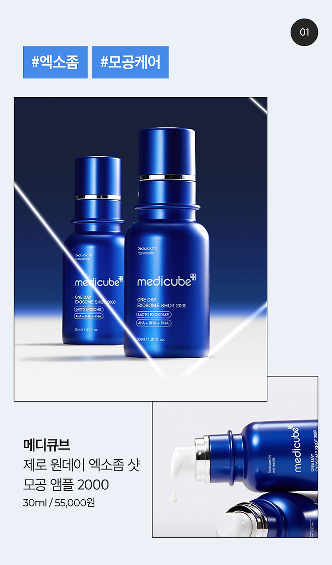 모공 타이트닝에 효과적인 유효성분인 엑소좀을 함유한 니들 앰플. 모공보다 13배 작은 크기의 니들이 모공에 직접 꽂혀 엑소좀을 피부 깊숙이 흡수시켜주는데요. 촉촉하면서도 깔끔하게 마무리될 뿐만 아니라 이후 사용하는 제품의 흡수율을 242%*높여주어 피부 컨디션의 변화를 빠르게 확인할 수 있어요. 엑소좀 샷 모공 앰플은 메디큐브의 디바이스 에어샷과 함께 사용하면 더 드라마틱한 모공 케어 효과를 확인할 수 있어요.