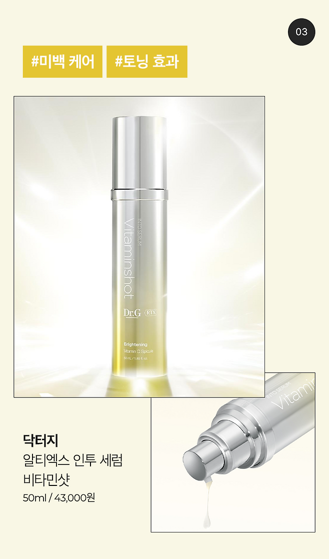 미백·잡티 케어를 위한 스피큘 세럼을 찾고 있다면 닥터지의 비타민샷 추천! 에어로 스피큘™은 각질층보다 3배 긴 길이의 스피큘 속 미세 통로에 순수 비타민C가 코팅된 닥터지만의 성분인데요. 피부 속 깊숙이 비타민C와 나이아신아마이드, 비타민E 엑소좀을 전달해 주어 사용 직후 투명하게 빛나는 피부를 바로 확인할 수 있어요.
