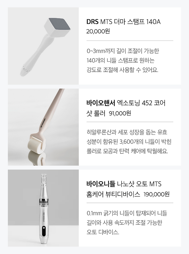홈케어용 MTS 디바이스는 스탬프 / 롤러 / 오토 형태가 있어요. 일정한 압력으로 눌러 사용해야 하는 디바이스 특성상 잘못 사용시 피부에 불필요한 자극을 줄 수 있어 초보자들은 유의해서 사용해야 해요.
