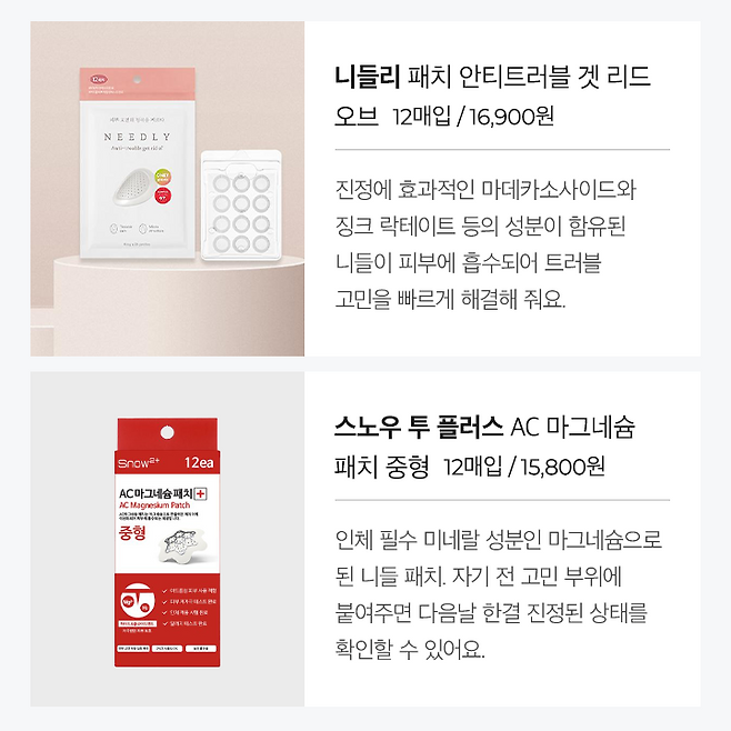 딱딱하게 안쪽에 생겨난 트러블 또는 터진 직후 상처를 진정시켜주는 트러블 패치. 피부에 흡수되어 녹는 타입의 니들과 녹지 않는 타입으로 나뉘어요.