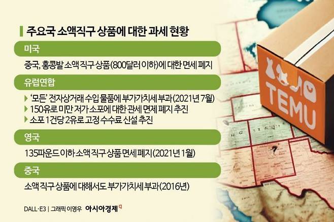 유럽연합(EU)은 2021년 7월부터 모든 전자상거래 수입 물품에 부가가치세를 매기고 있다. 기존에 존재하던 22유로(약 3만5500원) 미만 면세 혜택은 폐지했다. 올해 들어서는 150유로(약 24만2385원) 미만 저가 소포에 대한 관세 면제 제도도 전면 폐지할 계획이다. 추가적으로 소포 1건당 2건의 고정 수수료를 전자상거래 플랫폼에 새롭게 부과하는 방안도 검토하고 있다. 영국은 2021년에 135파운드(약 25만2078원) 이하 소액 직구 상품 면세를 폐지한 상태다.