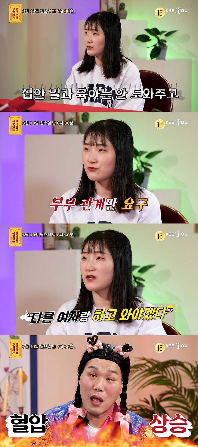(엑스포츠뉴스 김보민 기자) 부부관계만 요구하는 베짱이 남편인 사연자의 이야기에 이수근과 서장훈이 폭발한다.