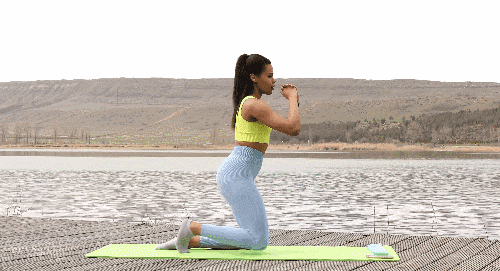 매트에 무릎을 꿇고 앉습니다. 오른발을 앞으로 당기며 발바닥을 바닥에 붙이고, 상체를 세웁니다. 왼발도 바닥에 붙이며 양발이 바닥에 놓이게 합니다. 상체를 고정한 상태에서 스쿼트 동작을 합니다. 차례로 발을 뒤로 보내며 다시 무릎을 꿇는 자세로 돌아갑니다.