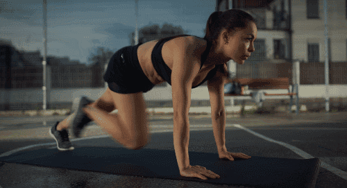 플랭크 자세에서 시작합니다. 왼쪽 무릎을 가슴 쪽으로 당겨옵니다. 왼쪽 다리를 원위치로 되돌리면서 즉시 오른쪽 무릎을 당겨옵니다. 두 무릎을 번갈아 가며 빠르게 당기며 반복합니다.