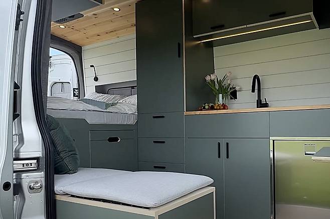 주방은 실용적이면서도 미적인 감각이 돋보인다. 부처블럭 상판, 깊은 싱크 볼, 인덕션이 갖춰져 있으며 아래쪽에는 스테인리스 도어 냉장고가 올리브그린 톤의 수납장과 조화를 이룬다. 상부에는 오버헤드 캐비닛이 추가돼 저장 공간이 넉넉하다. 전면부 조수석은 회전식으로, 간단한 워크스테이션이나 여유로운 휴식 공간으로도 활용할 수 있다.