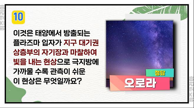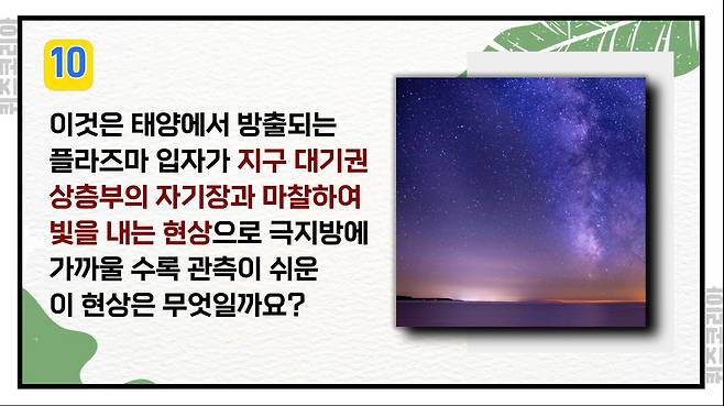 이것은 태양에서 방출되는 플라즈마 입자가 지구 대기권 상층부의 자기장과 마찰하여 빛을 내는 현상으로 극지방에 가까울 수록 관측이 쉬운 이 현상은 무엇일까요?