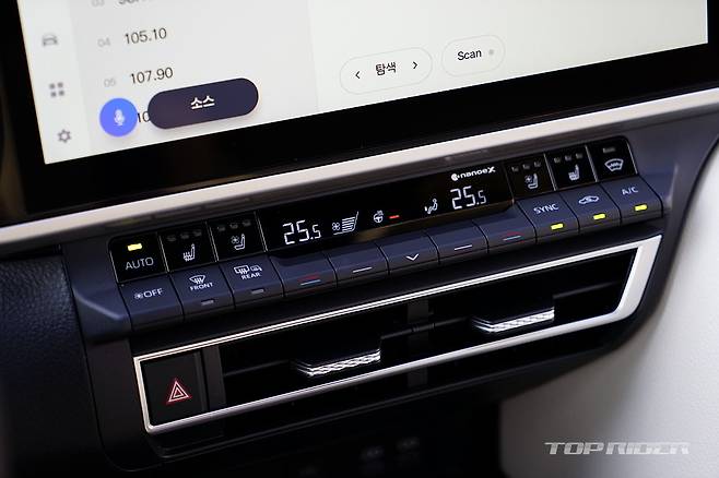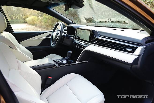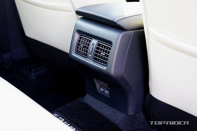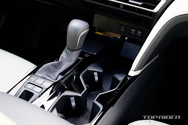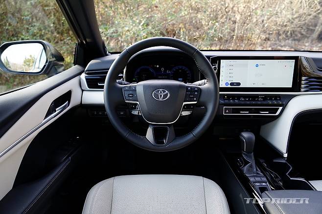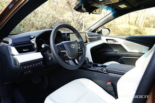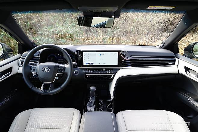 실내는 변화의 폭이 상당하다. 기존 캠리는 불안정한 곡선 중심으로 다소 투박했는데, 신형 캠리는 수평형 레이아웃의 단정한 분위기다. 부분적으로 크림 컬러 인조가죽을 더한 화사한 분위기에, 렉서스와 유사한 공조장치 조작부, 가로형 디스플레이를 통해 고급감을 더했다.