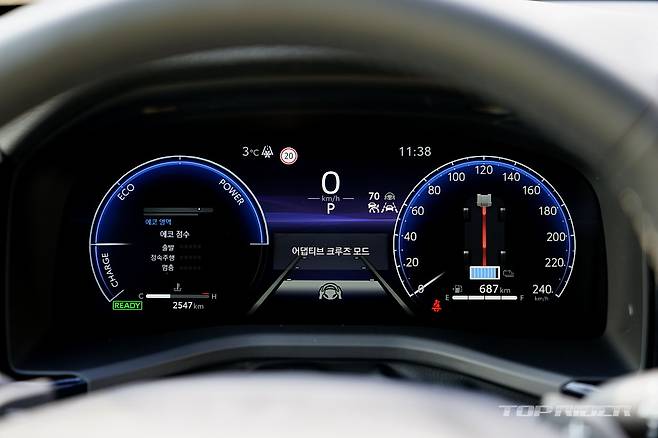적극적인 가감속이 반복되는 상황에서도 배터리 충전량이 꾸준히 유지되는 점은 토요타 2-모터 하이브리드의 강점이다. 스포츠모드에서는 오히려 전력량이 남아돈다. 중저속에서의 승차감은 부드럽고 안정적이다. 요철이나 과속방지턱을 넘는 동작에서도 큰 불만이 없다.