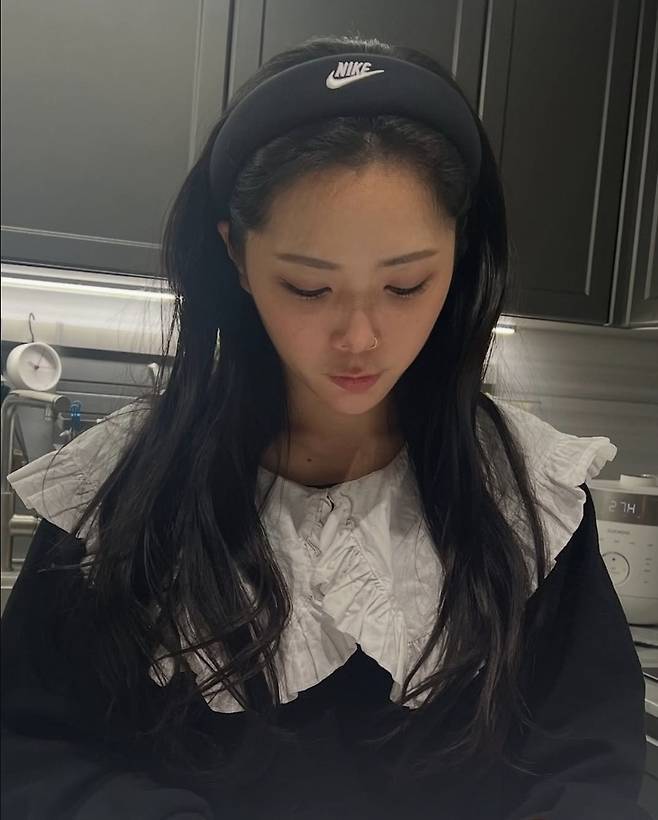 또 다른 사진에서 프릴 디테일이 돋보이는 블랙 원피스에 헤어밴드를 매치한 허니제이는 걸리시하면서도 스포티한 무드를 연출했습니다.