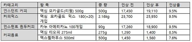 또 맥심 티오피(275㎖)는 1천290원에서 1천400원으로, 맥스웰하우스(500㎖)는 1천450원에서 1천560원으로 각각 오른다.