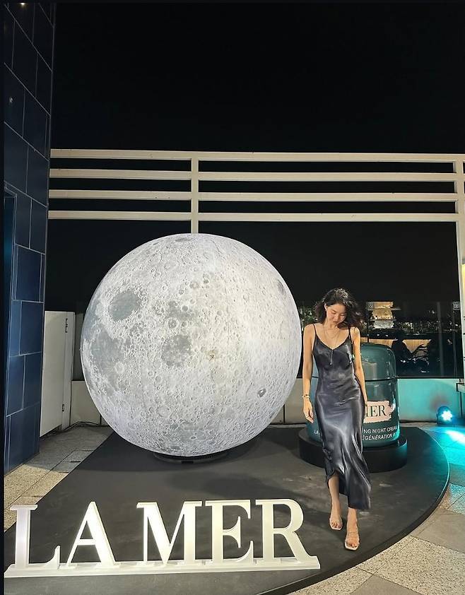 드레스의 얇은 스트랩과 미니멀한 디자인은 고급스러운 무드를 자아내며, 백그라운드에 놓인 달 모형과 어우러져 한 편의 영화 같은 장면을 연출했습니다.