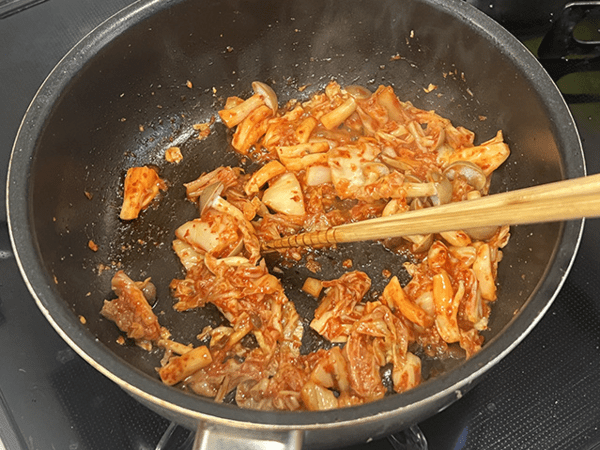 김치볶음에 물을 넣는 것이 의외로 중요하다. 물 반 컵을 넣어주면 김치 양념이 한 번 더 풀어지면서 전체적으로 고르게 퍼진다.