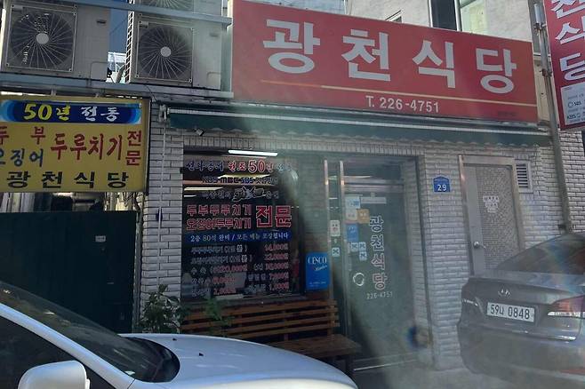광천식당의 대표 메뉴는 두루치기와 수육! 매콤한 양념에 큼직하게 썬 두부와 오징어를 볶아 만든 두부 두루치기는 돼지고기를 못 먹는 사람들도 부담 없이 즐길 수 있는 마법의 두루치기랍니다.