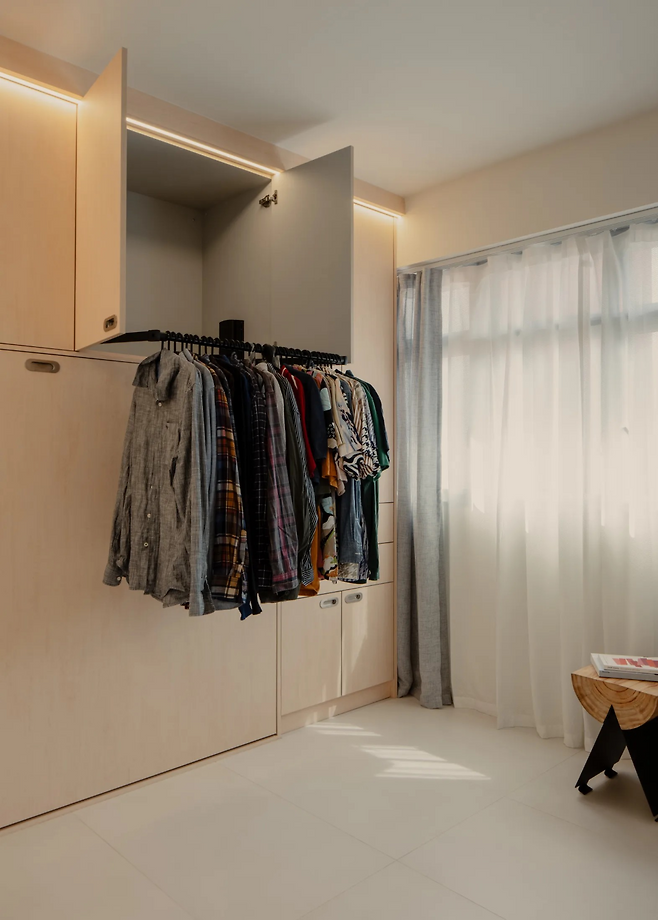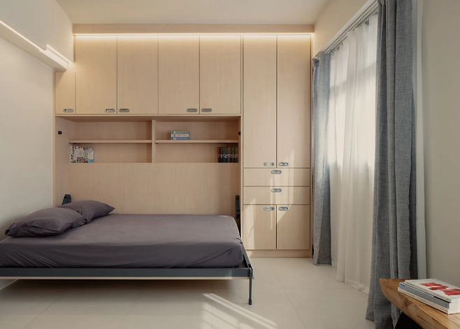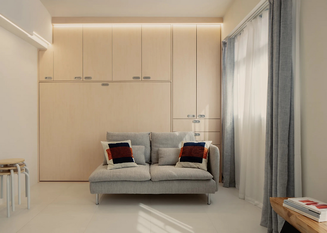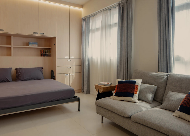 월 베드와 폴 다운 행거 같은 접이식 가구는 한정된 공간에서 최고의 효율을 발휘한다. 월 베드는 낮에는 벽에 접어 거실로 쓰고, 밤에는 침대로 변신해 공간을 다목적으로 활용할 수 있다. 폴 다운 행거는 높은 수납 공간도 쉽게 이용하게 해 공간 낭비를 줄이고, 옷을 체계적으로 보관할 수 있다.