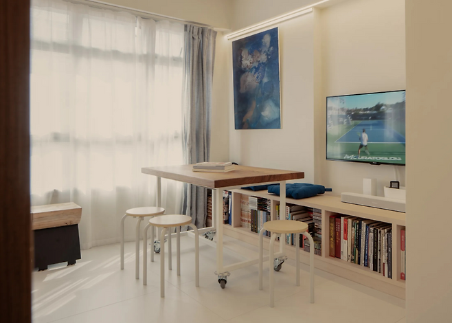 맞춤 제작한 4인용 이동식 테이블은 식탁, 작업대, 홈 카페 테이블 등 다목적 활용이 가능하다. 큰 힘을 들이지 않고 원하는 위치로 옮길 수 있어 원룸처럼 한 공간에서 다양한 생활 패턴을 소화하는 데 최적이다. 상황별로 테이블 위치를 조정하면 공간의 흐름이 유연해지고 시각적으로도 새로워진다.