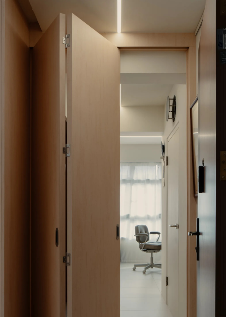 복도 중앙에 설치한 접이식 중문은 냉·온기를 잡아주며 현관과 거실 사이의 경계를 만든다. 주방 하부장은 미닫이문으로 설계해 개방 시 공간을 차지하지 않으며, 홈 카페 콘셉트로 꾸며 감각적인 분위기를 더했다. 작은 변화지만 생활 편의성을 높이고 공간의 완성도를 끌어올린다.