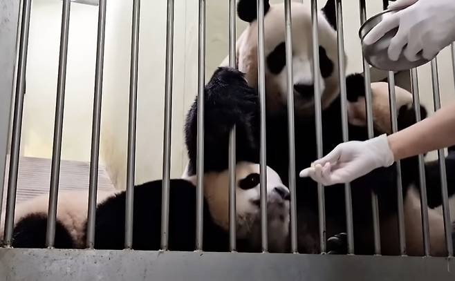 이때 아이들은 밥을 다 먹고 난 뒤였습니다. 밥 먹을 때가 아니거나, 자신이 휴식을 취해야 할 때면 아이바오는 단호하게 밥 주는 것을 거부하곤 하는데요.