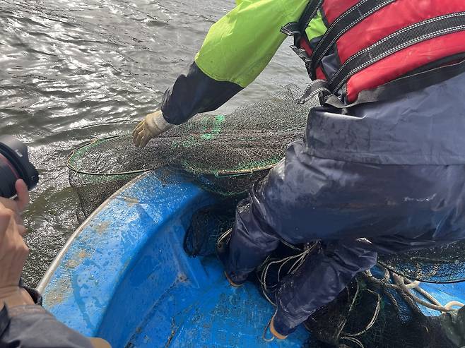 밤섬 인근에 펼쳐진 어망은 총 3개로, 개당 15m 규모다. 한강 5호에 탄 작업자 두 명은 그물을 끌어올리고 또 다른 한 명은 어종을 기록했다. 모두 미래한강본부 소속 직원들이았다.