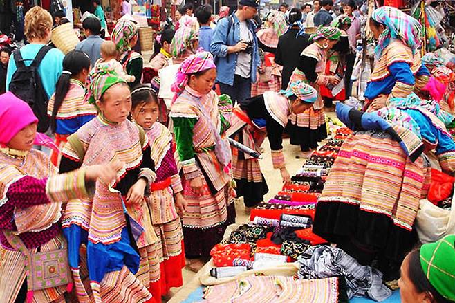 베트남 전통 모자를 쓰고 소수민족 의상을 입은 사람들의 모습이 인상적이죠.