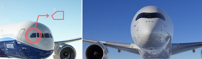 좌측 사진의 B787 드림라이너는 뾰족한 창 같은 느낌이며 창문이 4개입니다. 우측의 A350은 물안경을 쓴 듯한 둥근 모양에, 창문은 6개입니다. 이 외에도 창문 개수가 다른데 A350이 B787보다 창문이 작고 많습니다.