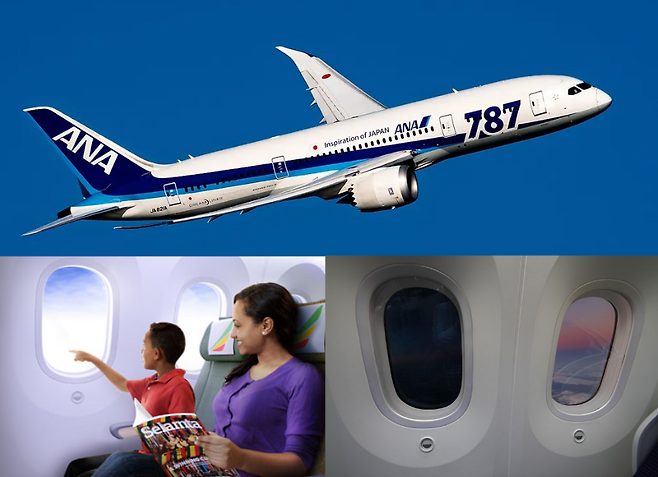 보잉 787의 큰 특징 중의 하나는 창문 덮개가 없다는 점인데요. 항공기가 이륙하거나 착륙할 때마다 승무원이 “창문 덮개를 열어주세요”라는 요청을 하지 않아도, 비행 고도에 올라서면 자동으로 창문의 색깔이 변하는 스마트한 기능이 탑재되어 있습니다.