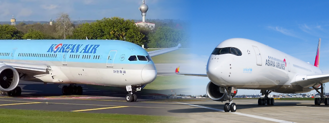 다음으로 항공기 기종을 도입한 항공사에 따라 구별하는 방법이 있는데요. 보잉의 최신 기종인 B787은 대한항공이, 에어버스의 최신 기종인 A350은 아시아나가 도입했습니다. 대한항공은 에어버스보다 보잉사의 항공기를 많이 운영하고 있으며, 아시아나항공은 보잉사 기종을 퇴역시키고 에어버스사 기종을 추가 도입하는 추세입니다.