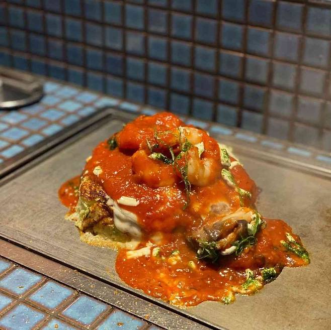 ▲가격: 토마토 새우 오코노미야끼 17,000원 클래식 돼지고기 야끼소바 16,000원