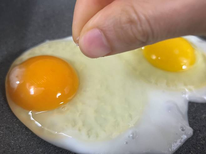 밥 1 공기 기준 계란 2알 넣습니다. 계란은 식용유 두르고 프라이를 만들어 줍니다. 소금으로 약간 간을 해 주세요.