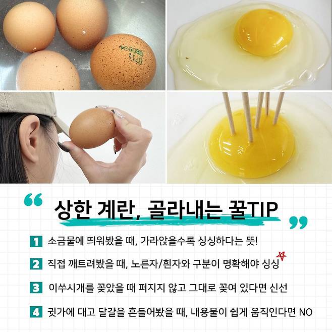 그도 그럴 게 계란이 상할수록 내부에 공기주머니가 생겨서 소금물에 뜨는 성질이 있다고 해요.