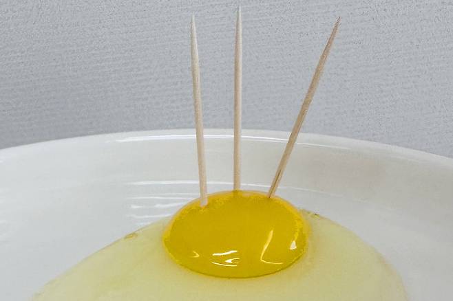 이쑤시개를 꽂았을 때 노른자가 퍼지지 않고 그대로 꽂여 있다면 신선.