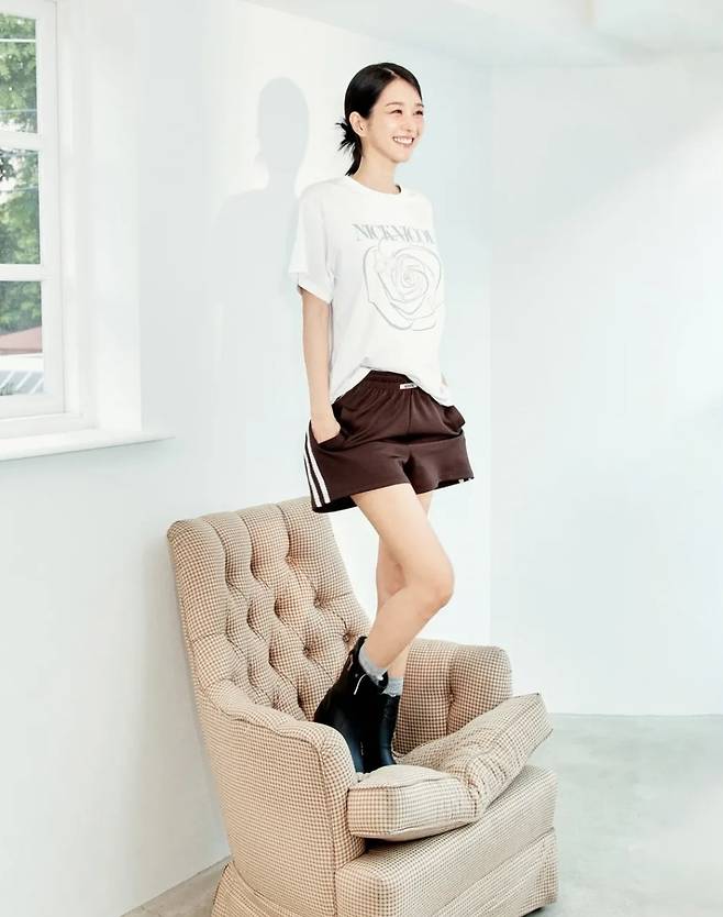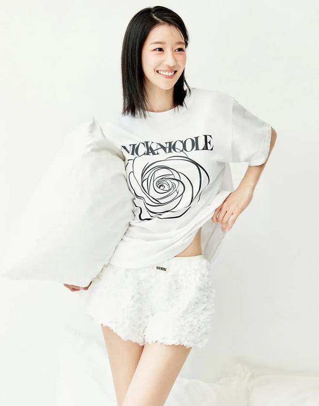 서예지는 로즈 프린팅이 포인트인 반팔 티셔츠를 살짝 들어 올린 채 밝게 웃는 컷을 연출하며 슬림한 복근을 고스란히 드러냈습니다.