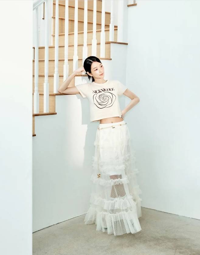 또 다른 컷에서는 허리 라인이 돋보이는 크롭티에 시스루 러플 롱스커트를 매치해 순백의 소녀미와 고혹적인 무드를 동시에 드러냈으며, 매끈한 팔 라인과 긴 목선이 더해져 서예지만의 독보적인 분위기를 완성했습니다.