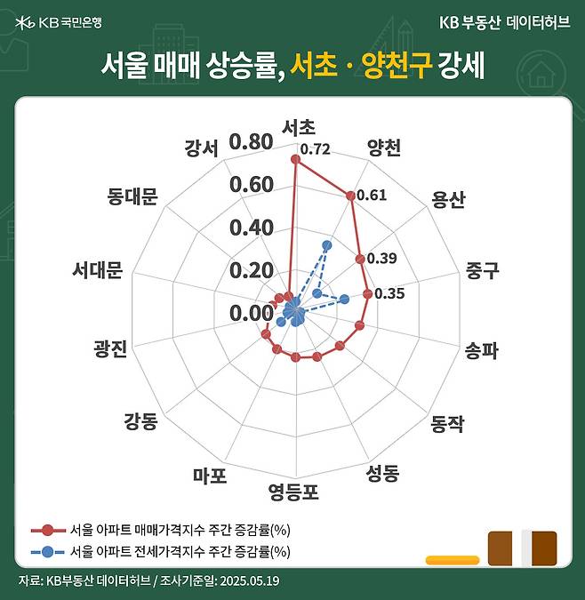 전국 권역별 매매가격은 세종이 0.37% 올라 서울을 제치고 1순위입니다. 조기대선 과정에서 세종시 국회의사당 및 대통령 집무실 이전 등 호재성 이슈 부각으로 강세를 시현하고 있습니다. 서울도 금리 인하를 염두에 둔 저가매수세가 유입되면서 2순위로 집계됐습니다. 서울 상승 1순위는 교육ㆍ교통 인프라 환경이 우수한 서초구로 0.72% 올랐습니다. 반포동, 잠원동 주요 단지의 호가가 오름세입니다. 2순위는 양천구로 0.61% 올랐습니다. 활발하게 재건축이 진행되고 있는 목동신시가지 단지를 중심으로 문의가 이어졌습니다.