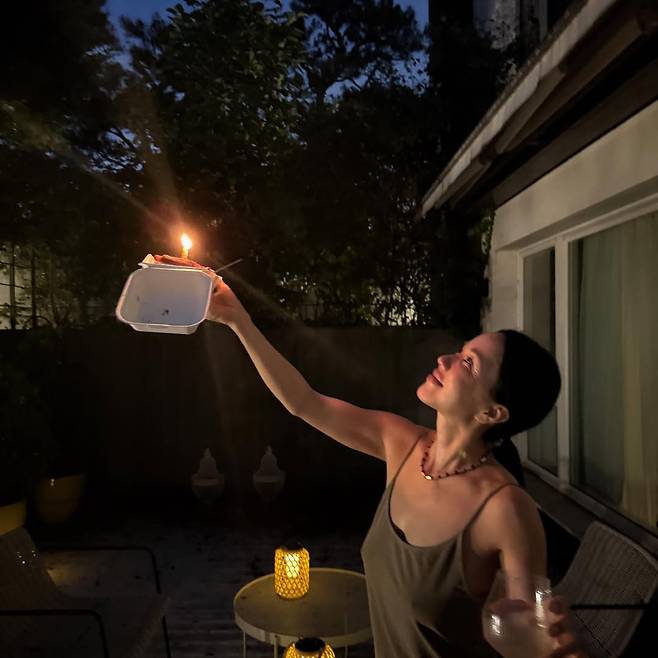 어두운 야외 테라스에서 작은 촛불만 켜진 상황임에도 엄정화의 얼굴은 조명 없이도 자연스럽게 빛을 발했다.