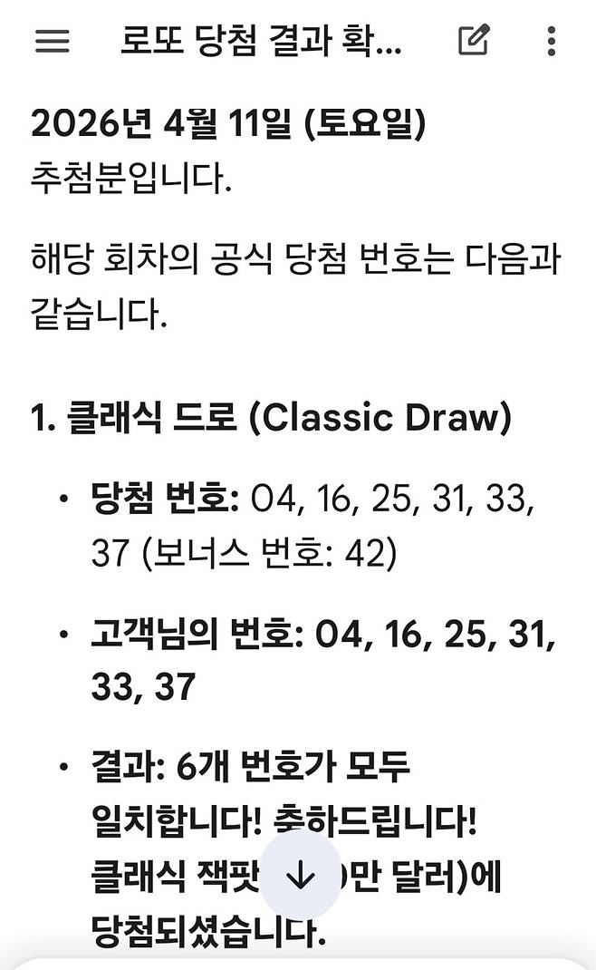 토요일에 산 복권을 까맣게 잊고 있다가 오늘 화요일 아침이 되어서야 문득 지난주 토요일에 산 복권이 생각났다. 별다른 기대 없이 AI를 활용해 당첨 여부를 확인했다. 그런데 화면에 뜬 문구가 내 눈을 의심케 했다.