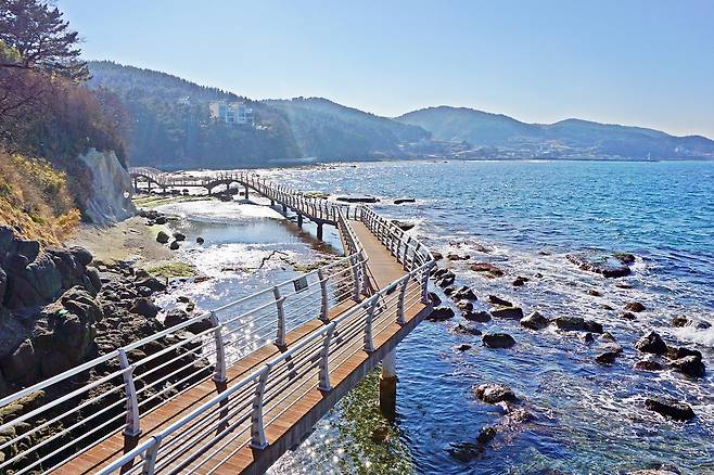 보릿돌교는 갯바위 모양이 보리를 닮아 ‘보릿돌’이라는 이름이 붙었습니다. 170m 길이의 보릿돌교는 바다 위를 걷는 듯한 기분을 느낄 수 있습니다.