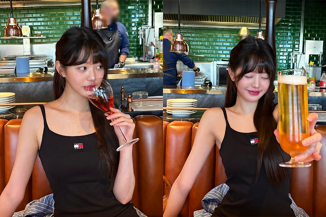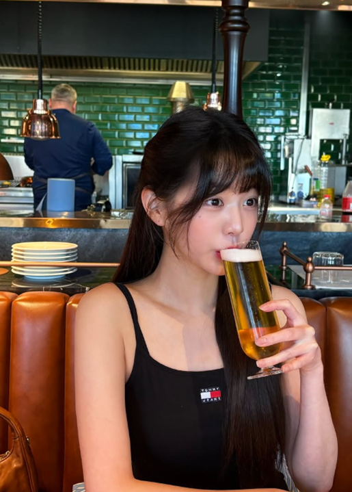 자연스러운 민낯 메이크업과 투명한 물광 피부, 유리잔에 담긴 맥주를 든 모습까지 더해져, 마치 남자친구가 찍어준 듯한 데이트 감성의 비주얼을 완성했다는 반응이다.