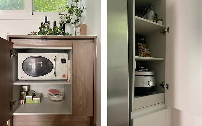자취 시절부터 쓰던 오래된 전자레인지도 딱 맞는 사이즈로 숨겼습니다. 밥솥까지도 키큰장에 숨겼어요. 사용할 때는 슬라이딩 선반을 꺼내어 쓰니 전혀 불편함은 못 느낍니다.