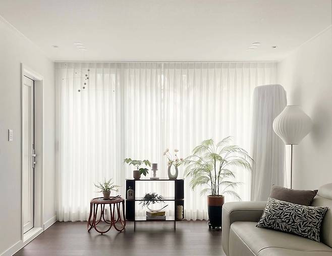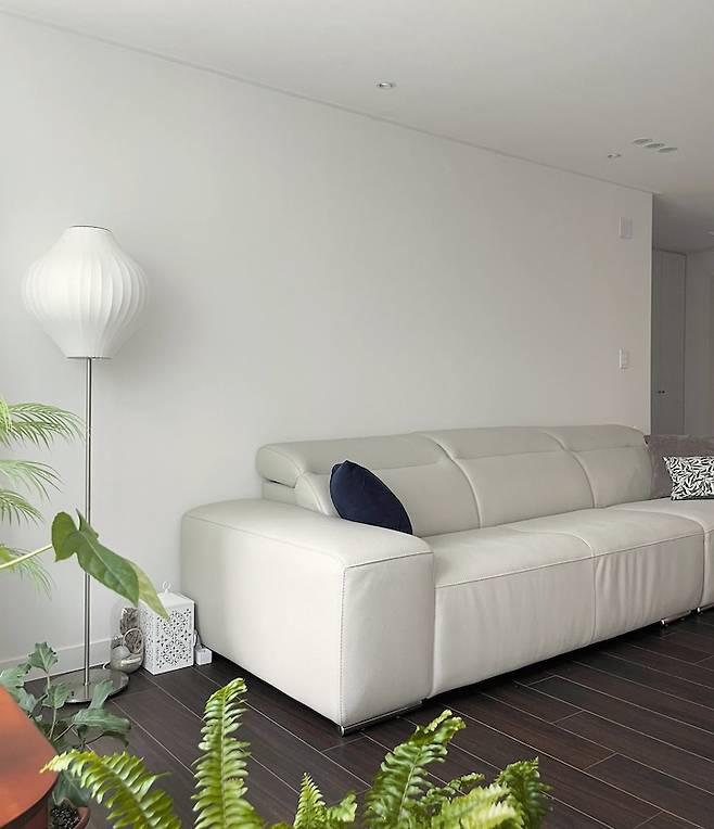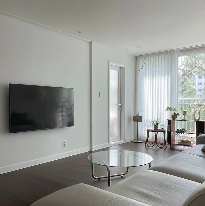 광폭 베란다가 확장된 덕분에 거실의 길이가 긴 편입니다. 큰 사이즈 소파를 두어도 공간이 꽤 남아서 장식장을 두고 좋아하는 소품들로 채워가는 중이에요.