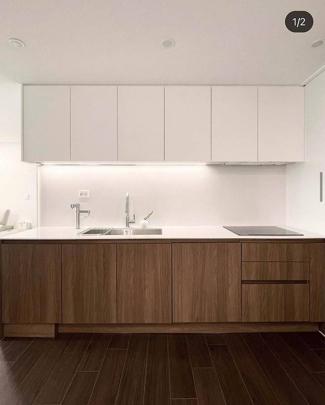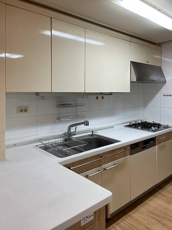 주방용품들이 어지럽게 나와 있는 것을 좋아하지 않는 편이에요. 첫 신혼집 때는 상부장이 없었어요. 보기에는 좋았지만 살림이 늘어날수록 정리가 안 되더라고요. 그래서 이번엔 고민 없이 상부장을 꽉 채워 넣었어요. 넉넉한 수납 덕분에 늘 깔끔한 주방을 유지하며 살고 있어요.