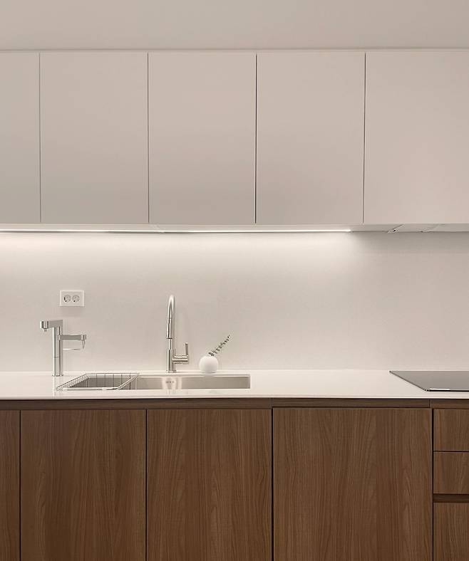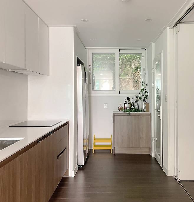 선과 면과 소재를 최대한 미니멀하게 연출하고 싶었던 저의 콘셉트가 가장 잘 반영된 공간인 것 같아요. 덕분에 좁은 주방이 덜 답답해 보이고 확장되어 보이는 효과가 있어요.