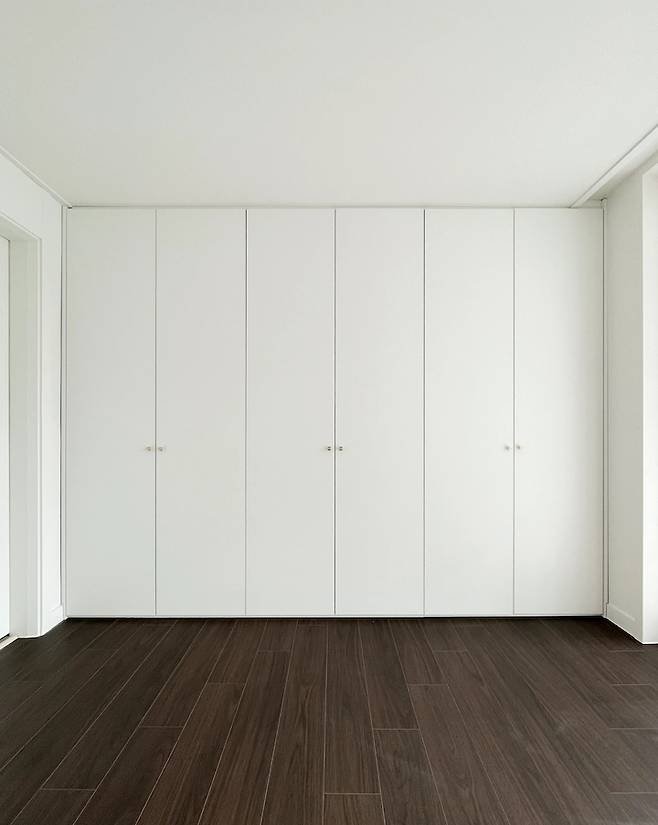한쪽 벽은 전실과 같은 디자인의 붙박이장을 짜서 계절 지난 옷과 이불을 수납하고, 반대쪽 벽은 별다른 가구 없이 침대만 두어 숙면을 위한 공간으로만 활용하고 있어요.