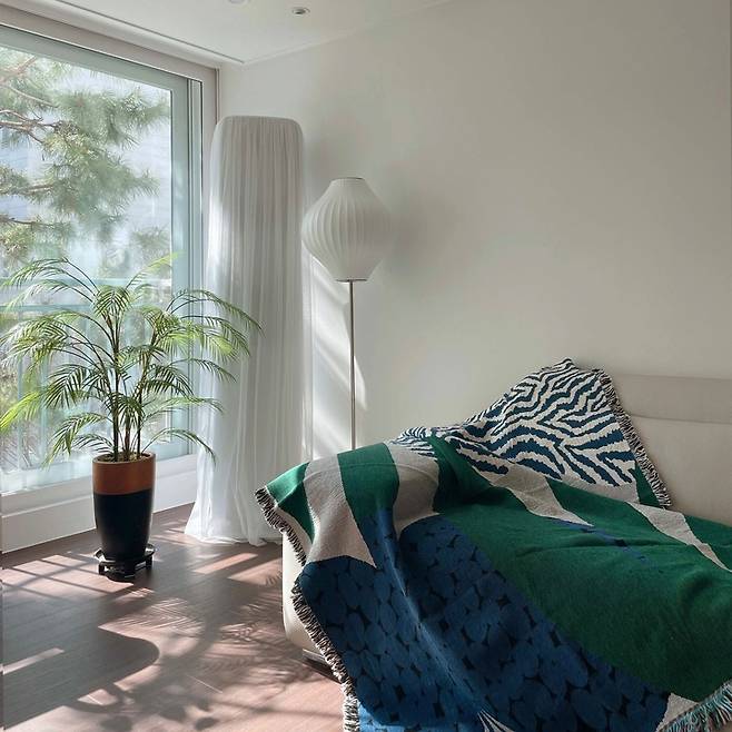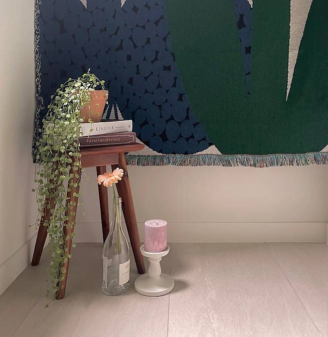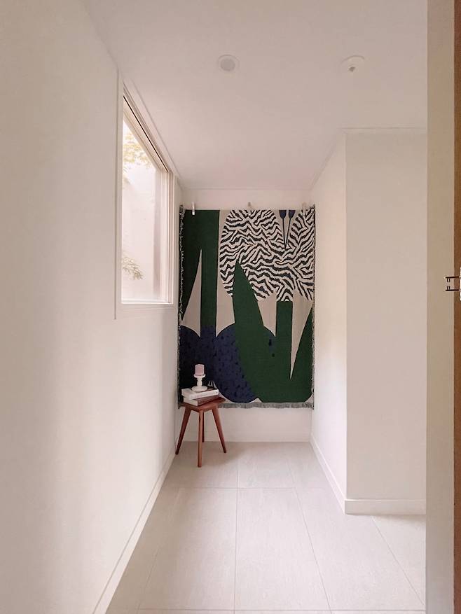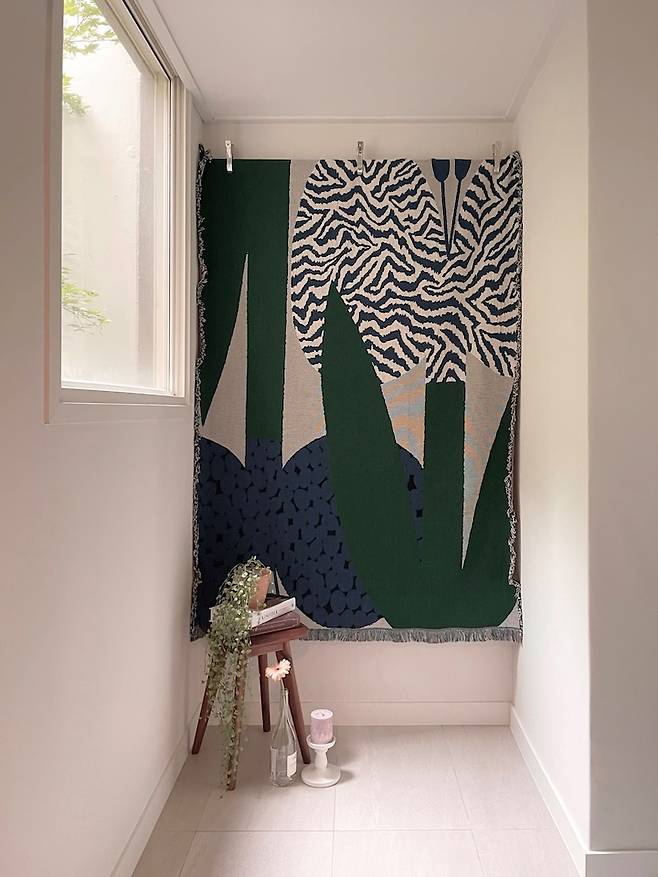 인테리어를 계획하면서 가장 먼저 구입한 소품이 슬로우다운스튜디오의 블랭킷입니다. 큼지막한 사이즈에 디자인까지 훌륭한 이 블랭킷은 활용도가 정말 높아요. 가장 최근엔 커튼봉을 이용해 간단하게 전실 벽면에 설치했는데 블랭킷의 디자인이 특히 여름과 잘 어울리는 것 같아요. 까슬거리는 천 특유의 질감이 확실히 액자와는 또 다른 매력이 있어요.