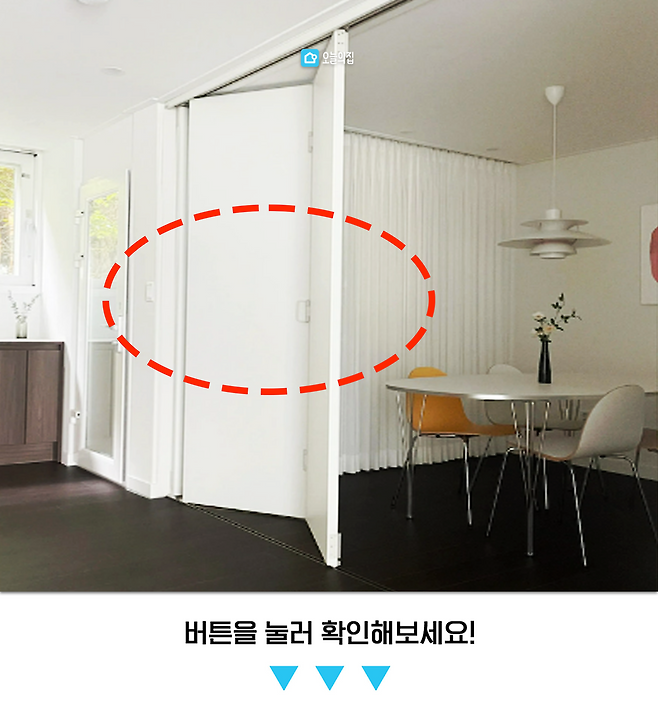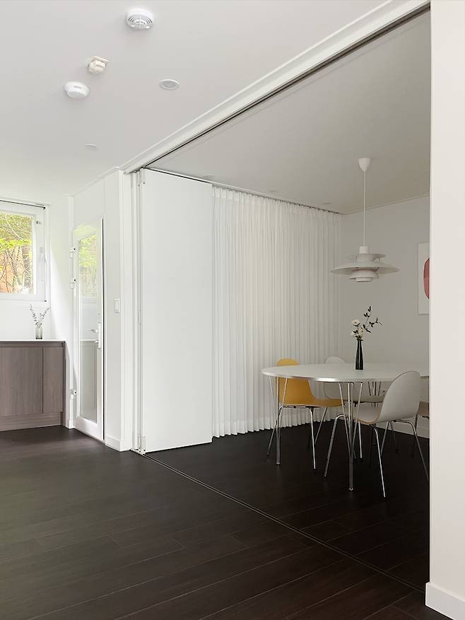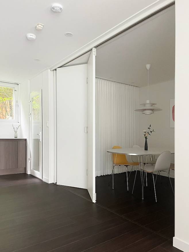 그리하여 완성된 다이닝룸의 모습입니다. 도어를 닫으면 자연스레 벽과 일체감을 이루어 히든스페이스로서 공간이 분리되고