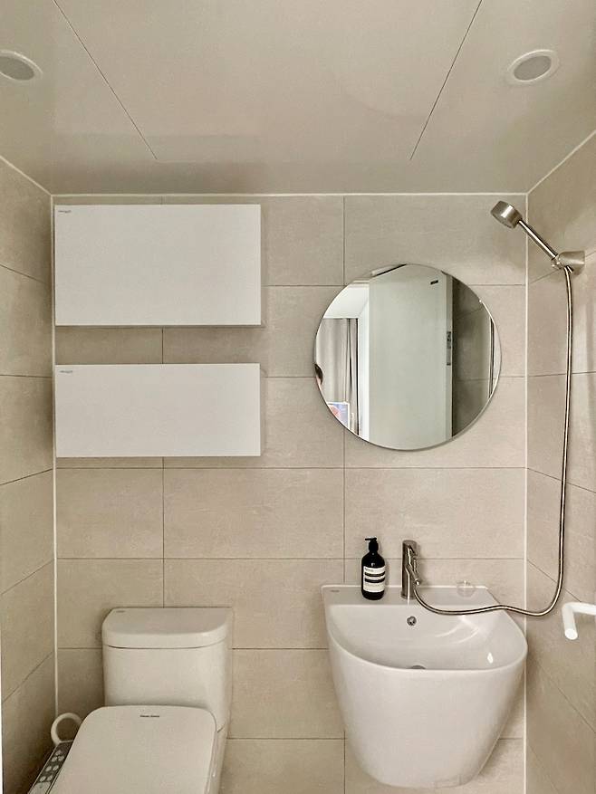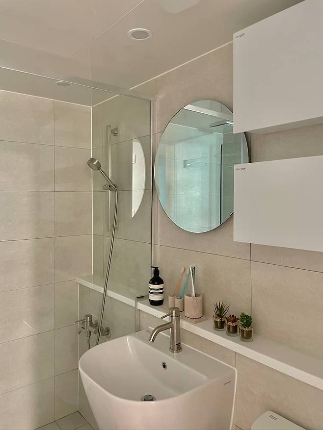 화장실만큼은 깨끗하고 청결하게 관리하는 것이 가장 중요하다고 생각했기 때문에 인테리어에 큰 공을 들이진 않았어요. 아늑한 느낌이 들도록 베이지색 타일을 시공하고 포인트로 원형 거울을 달았어요.