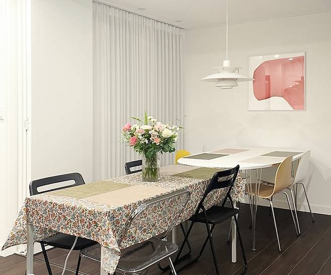 다음은 저희집의 히든스페이스 다이닝룸입니다. 주방에 큰 테이블을 두는것이 로망이었는데 좁고 긴 구조의 주방에 6인용 식탁을 두는 것은 불가능해 보여서 주방과 가장 가까운 방을 다이닝 공간으로 만들어봤어요.
