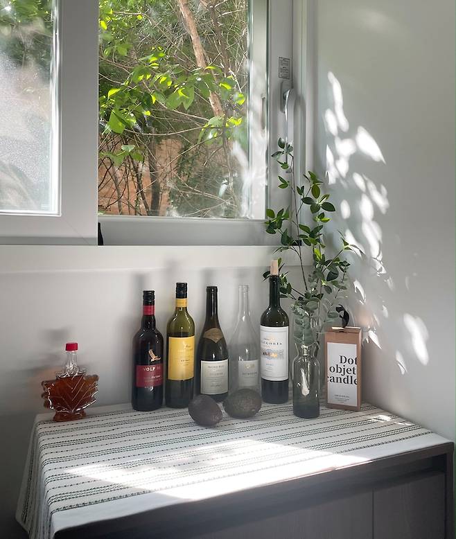 냉장고 옆으로는 보조장을 짜서 소형 주방 가전을 수납하고 평소 좋아하는 와인들을 두어 나름 홈바 분위기도 내고 있어요.