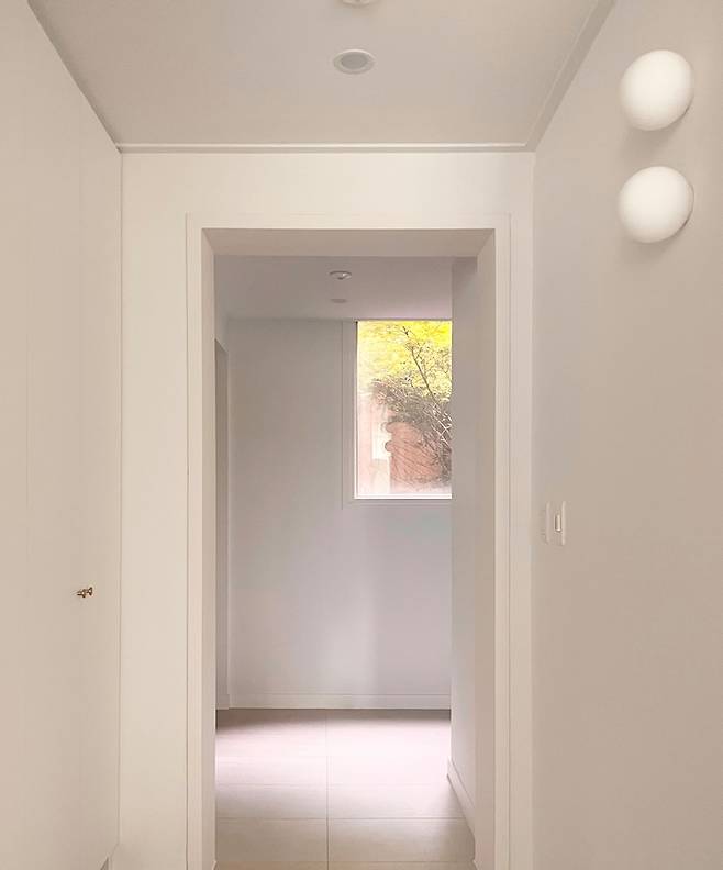 저희 집에 들어섰을 때 가장 먼저 보이는 모습이에요. 전실이 넓은 편이어서 이 공간을 어떻게 구성할지 정말 고민이 많았어요. 처음에는 팬트리를 짜서 수납 공간으로 활용할까 생각 했었는데, 철거 직후 현장을 찾았을 때 저 작은 창으로 스며드는 햇살과 살랑이는 나무 뷰가 너무 예쁜 거예요. 그 모습에 반해 온전히 비움의 공간으로 남겨두기로 결정했어요.