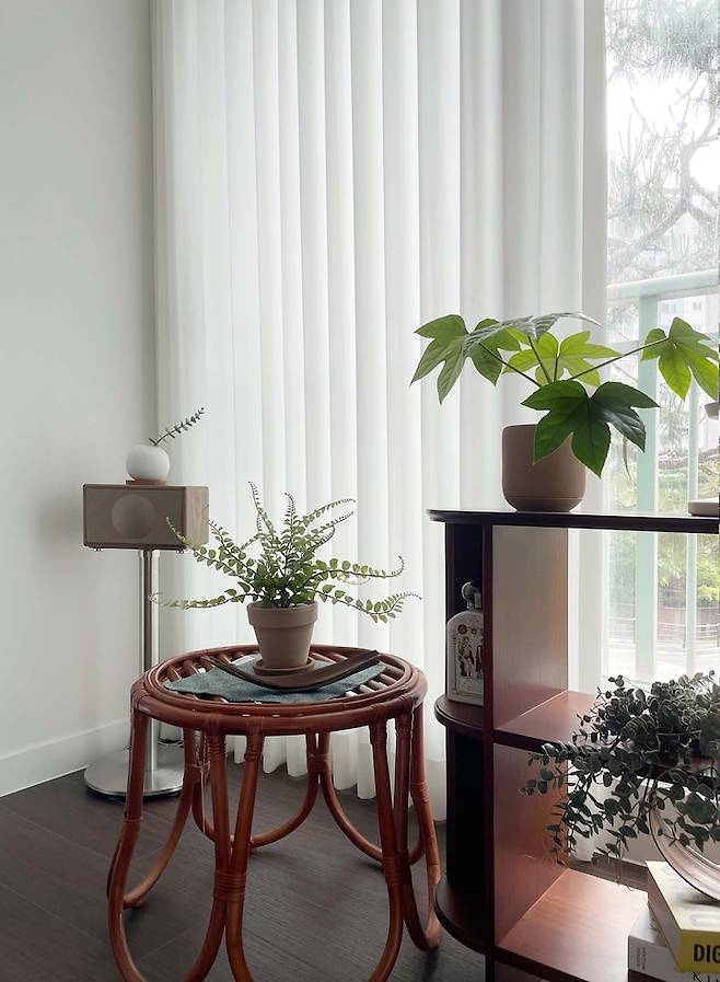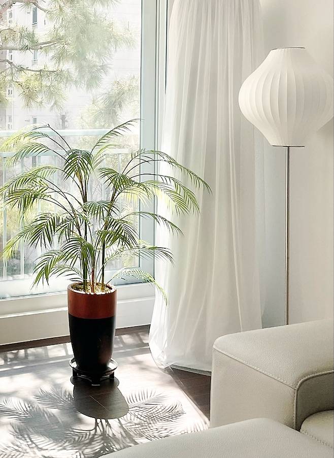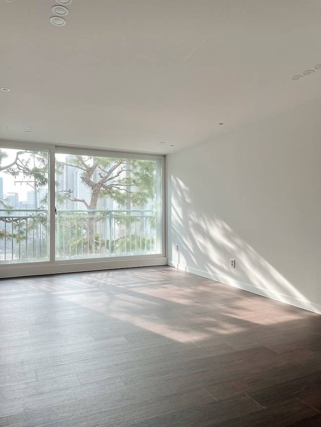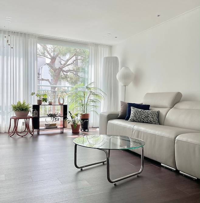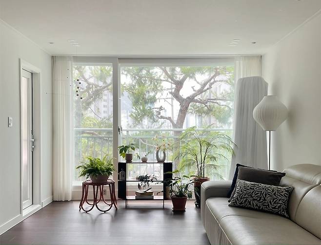 저희집의 가장 큰 매력은 소나무 뷰와 깊게 들어오는 채광인 듯 해요. 늦은 오후에 이 집을 처음 봤을 때는 가뜩이나 저층인데 바로 앞 큰 소나무가 채광을 가릴까 봐 걱정이었거든요. 막상 공사를 끝내고 보니 풍부한 채광에 소나무 뷰, 그 소나무가 만들어주는 그림자까지. 주말 낮엔 정원 뷰만 바라보고 있어도 힐링 되는 기분이에요.
